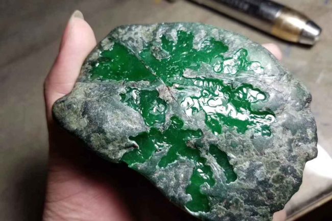皮壳是翡翠在搬运过程中,经过侵蚀,风化等作用形成的风化层,其特征往往与原料内部的质量紧密相关,根据皮壳的粗细、均匀、松紧和翻板,可以认识翡翠内部的质地。