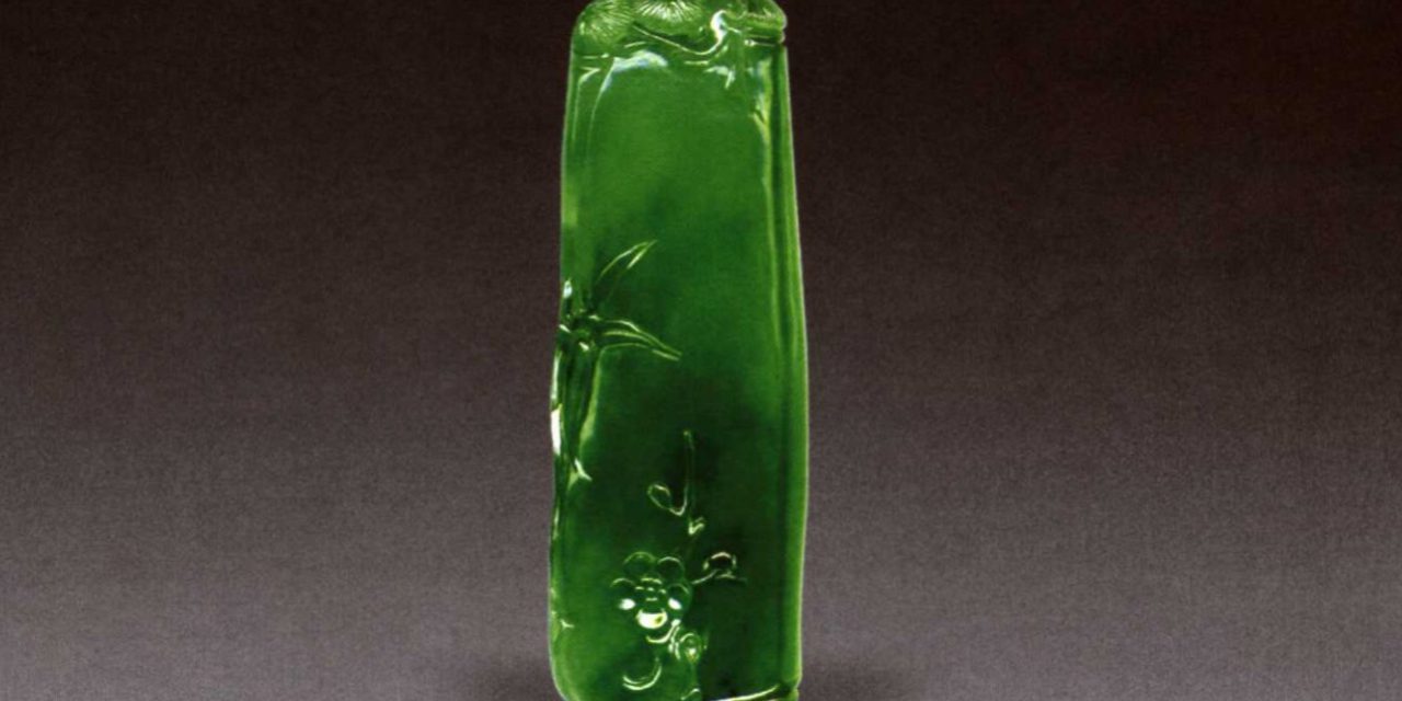 (翡翠岁寒三友玉佩,玻璃种艳绿翡翠,种份非常通透,颜色鲜艳均匀。雕松、竹、梅岁寒三友,整体非常完美难得。20年前市场指导价:200万-300万)
