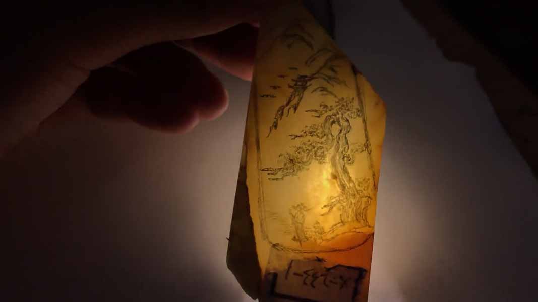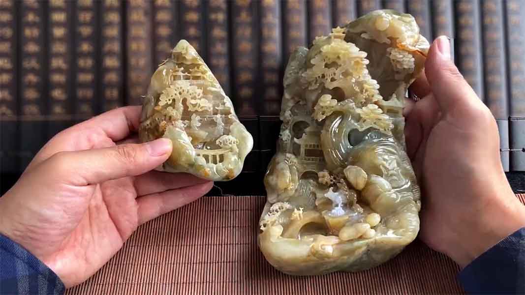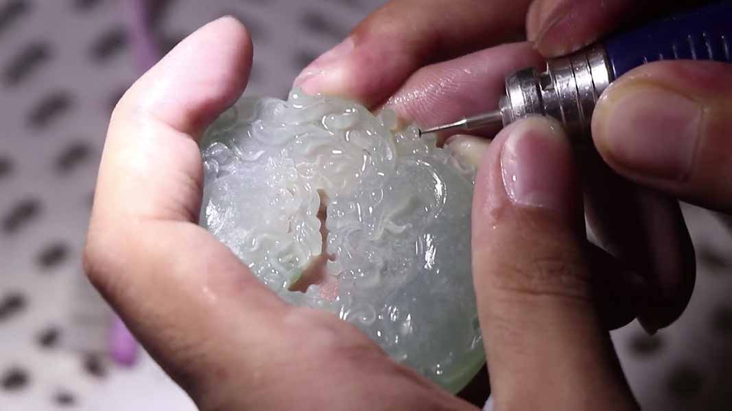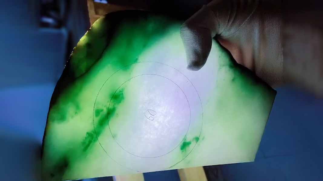 翡翠表皮隐约可见的一些象干了的苔鲜一样的团块、斑块、条带状物,称为松花,这是翡翠内部的绿在皮壳上的反映,是翡翠原料上的绿风化后渐渐失色留下的痕迹